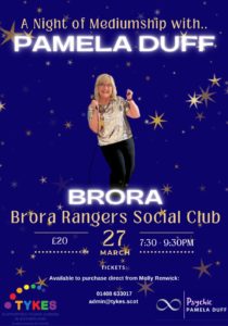 Join us on Friday 27th March at 7:30pm in Brora Rangers Social Club, with special guest Psychic Pamela Duff.